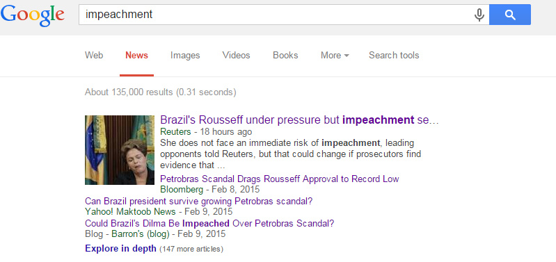 O recente debate nacional a respeito da possibilidade de impeachment da presidente Dilma Rousseff chegou à imprensa internacional. Nesta quarta-feira (11), as principais notícias sobre o termo “impeachment” em inglês são relacionadas ao Brasil, segundo a área de busca por notícias do Google (até um dia antes, apareciam com mais destaque reportagens sobre lugares como a Tailândia). A imagem que se passa é a de um país em meio a turbulências políticas influenciadas por corrupção e por uma abordagem emocional do tema, mas aparenta haver interesse em mostrar que há caminhos menos radicais que podem levar o país de volta à estabilidade.