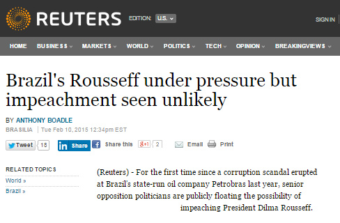 Dilma “não encara um risco imediato de impeachment”, diz a reportagem, que completa alegando que isso pode mudar se houve provas de envolvimento dela na corrupção da Petrobras. Segundo a Reuters, protestos pedindo nas ruas a derrubada da presidente “reuniram poucas centenas de pessoas e líderes da oposição tomaram cuidado para se distanciar”.