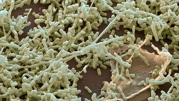 Cerca de 100 mil bactérias se aglomeram em um corpo amarelado. Algumas delas desenvolvem esporos arredondados que não precisam de alimentos ou água e podem esperar até que haja uma abundância de comida novamente.
