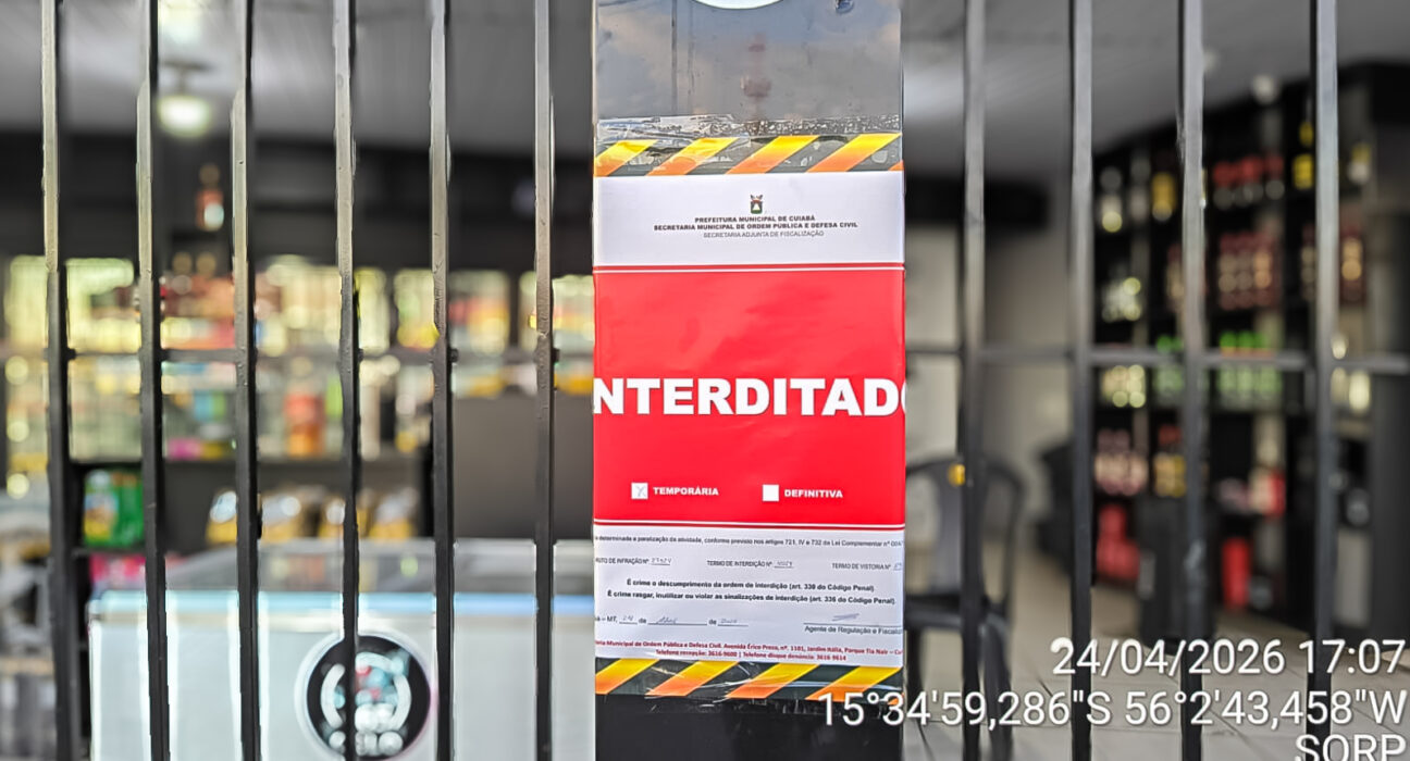 Uma distribuidora e tabacaria denunciada por poluição sonora foi interditada pela Prefeitura de Cuiabá, por meio da Secretaria Municipal de Ordem Pública (Sorp), após fiscalização constatar funcionamento irregular em área de passeio público, sem alvará de localização e funcionamento. A ação ocorreu na Avenida Governador Dante Martins de Oliveira, onde foi verificado que o estabelecimento exercia atividade comercial sobre o logradouro público.