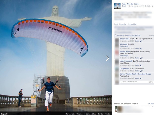 O empresário e paraquedista Tiago Amorim Cobra, 48 anos, morreu na tarde deste domingo (9) depois de pular de speed fly, uma espécie de parapente de velocidade, da Pedra Bonita, na Gávea. A informação foi confirmada pelo Corpo de Bombeiros.