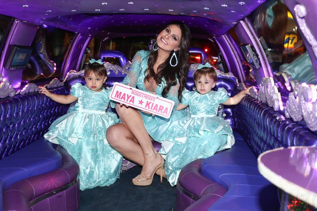 Leandro, do KLB, e Natália Guimarães fizeram uma superfesta para comemorar o aniversário de 2 anos das filhas gêmeas Maya e Kiara em um buffet em São Paulo nesta quarta-feira, 12. A mãe e as meninas chegaram ao local em uma limusine cor-de-rosa com cílios, no melhor estilo princesas da Disney – tema da comemoração. Com um vestido acinturado, combinando com os looks das aniversariantes, Natália chamou atenção pelo decote no modelito.