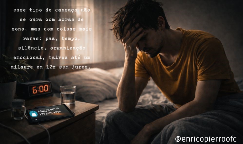 No final, o que resta é aceitar que esse tipo de cansaço não se cura com horas de sono, mas com coisas mais raras: paz, tempo, silêncio, organização emocional, talvez até um milagre em 12x sem juros. Enquanto isso não chega, a gente segue. Cansado. Tropeçando. Funcionando no modo economia de energia. E sobrevivendo, porque já é o suficiente.