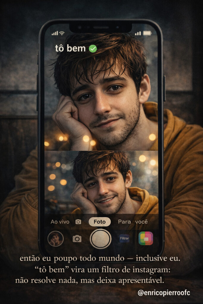 E a verdade é que ninguém quer realmente ouvir o verdadeiro “como eu tô”. Se eu respondo honestamente, o ambiente fica pesado. O ar muda. A pessoa pisca três vezes tentando achar uma frase motivacional no Google mental dela. Eu poupo todo mundo — inclusive eu. Então “tô bem” funciona como aquele filtro de Instagram: não resolve nada, mas deixa apresentável.