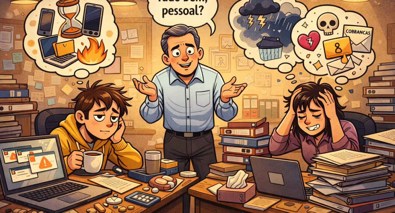 Quando alguém me pergunta “como você tá?”, meu cérebro abre umas 42 pastas de problemas ao mesmo tempo. Tem pasta chamada “não era para eu estar vivendo isso”, outra “como resolvo isso sem surtar”, outra “não quero falar sobre isso porque posso chorar ou posso bater em alguém, depende do humor”. Mas o que eu digo? “Tô bem”. Curto. Eficiente. Compatível com a bateria emocional em 3%.