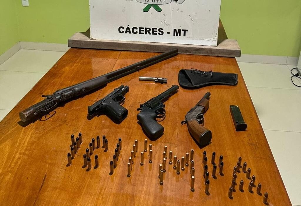 Policiais militares da 1ª Companhia Independente de Proteção Ambiental apreenderam, nesta sexta-feira (3.10), quatro armas de fogo, 72 munições e prenderam um homem em flagrante por crime ambiental, em Cáceres (220 km de Cuiabá).