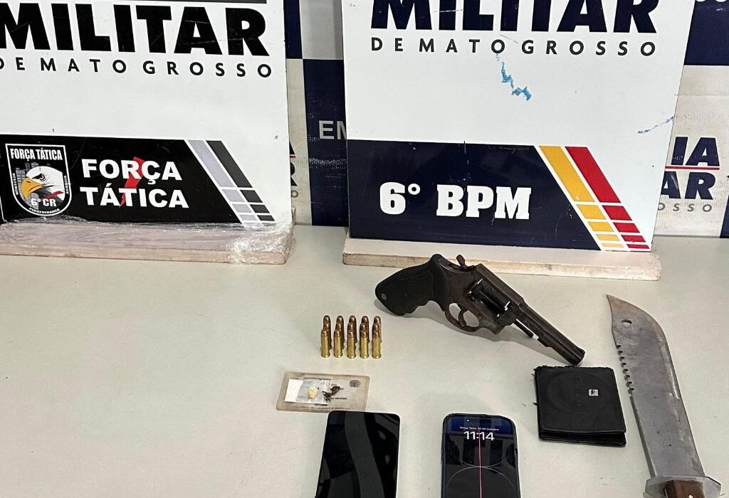 Policiais militares prenderam dois homens de 24 e 26 anos, membros de uma facção criminosa, por porte ilegal de arma de fogo e receptação, na manhã desta terça-feira (14.10), em Cáceres. Com a dupla, a PM apreendeu um revólver, 15 munições, um facão e porções de drogas.